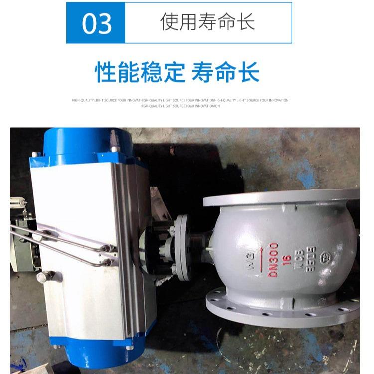 2、气动偏心球阀的V型切口具有切削功能,在关闭时能将介质中的杂物(树枝、纺织袋等)切断,保证阀门正常启闭。