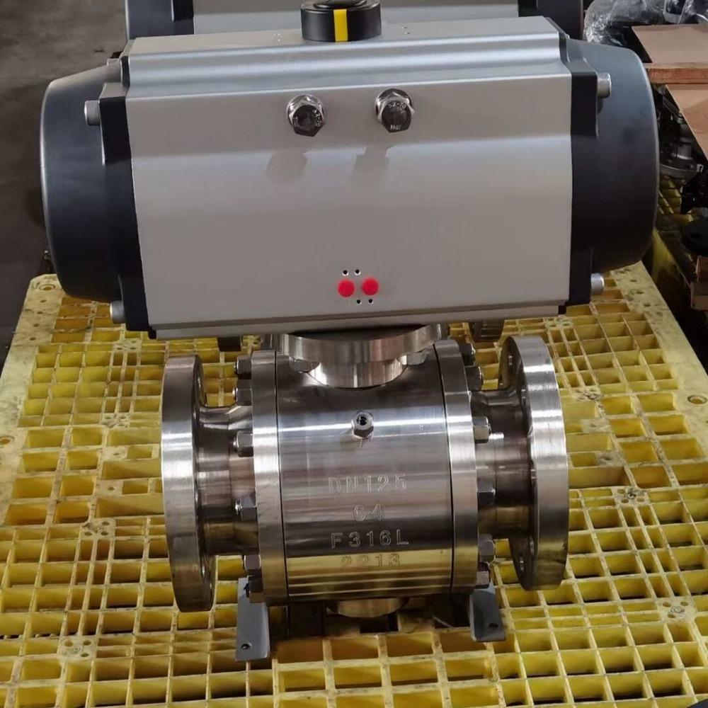 气动高压球阀由法兰/内螺纹锻造高压球阀与气动执行器组成,阀体材质均经过硬质及防腐处理,提高了阀体的强度,具有极好的耐压耐磨的优点。气动高压球阀采用三段式阀体,使结构更加紧凑且便于装配,适用于液压油,水,高压气体等介质。可配以阀门定位器输入4-20mA的模拟信号从而控制球芯运转的开度大小,实现对介质压力、流量、温度等参数的比例式调节。