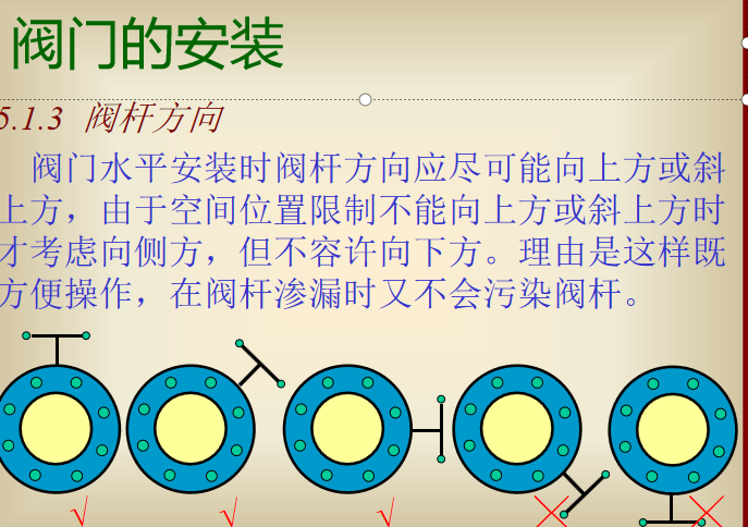 ♥ 安装空间小的部位宜采用蝶阀、球阀,如必须采用闸阀,要选暗杆式的。