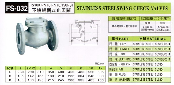 台湾富山阀门 不锈钢法兰止回阀.FS032