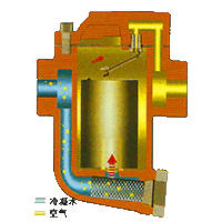 4、倒吊桶顶部舍友一个排气孔,当一部分蒸汽从小孔排出,另一部分蒸汽变成凝结水以及凝集水位升高时,倒吊桶市区浮力而下沉,连杆带动阀芯打开阀口,继续排放凝结水。 |