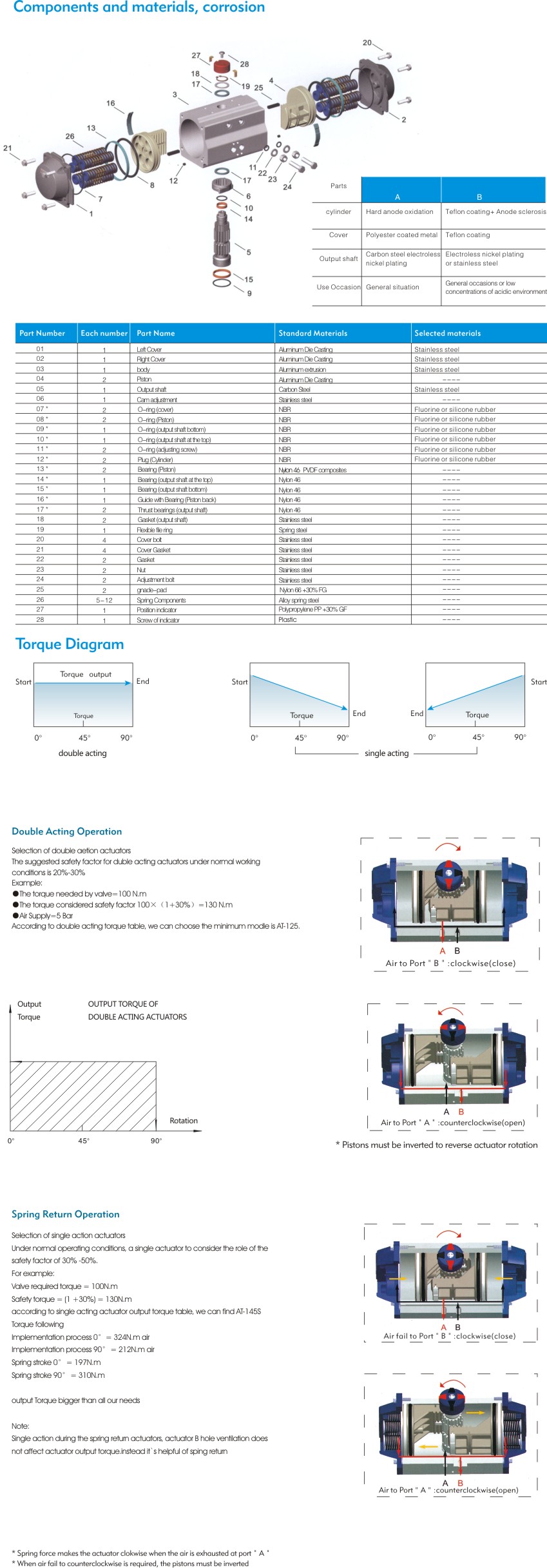 当压缩空气从A管咀进入气动执行器时,气体推动双活塞向两端(缸盖端)直线运动,活塞上的齿条带动旋转轴上的齿轮逆时针方向转动90度, 阀门即被打开。此时气动执行阀两端的气体随B管咀排出。反之,当压缩空气从B官咀进入气动执行器的两端时,气体推动双塞向中间直线运动,活塞上的齿条带动旋转轴上的齿轮顺时针方向转动90度,阀门即被关闭。此时气动执行器中间的气体随A管咀排出。以上为标准型的传动原理。根据用户需求,气动执行器可装置成与标准型相反的传动原理,即选准轴顺时针方向转动为开启阀门,逆时针方向转动为关闭阀门。单作用(弹簧复位型)气动执行器A管咀为进气口,B管咀为排气孔(B管咀应安装消声器)。A管咀进气为开启阀门,断气时靠弹簧力关闭阀门。