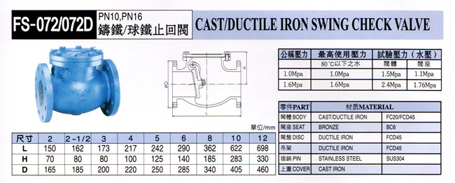 台湾富山FS072法兰止回阀型号,富山法兰止回阀规格,进口法兰止回阀报价,台湾进口阀门