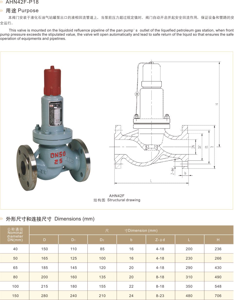 永一安全阀 中国永一阀门 平行式安全回流阀 本阀门安装于液化石油气站罐泵出口的液相回流管道上,当泵前压力超过规定值时,阀门自动开启并起安全回流作用,保证设备和管路的安全运行。