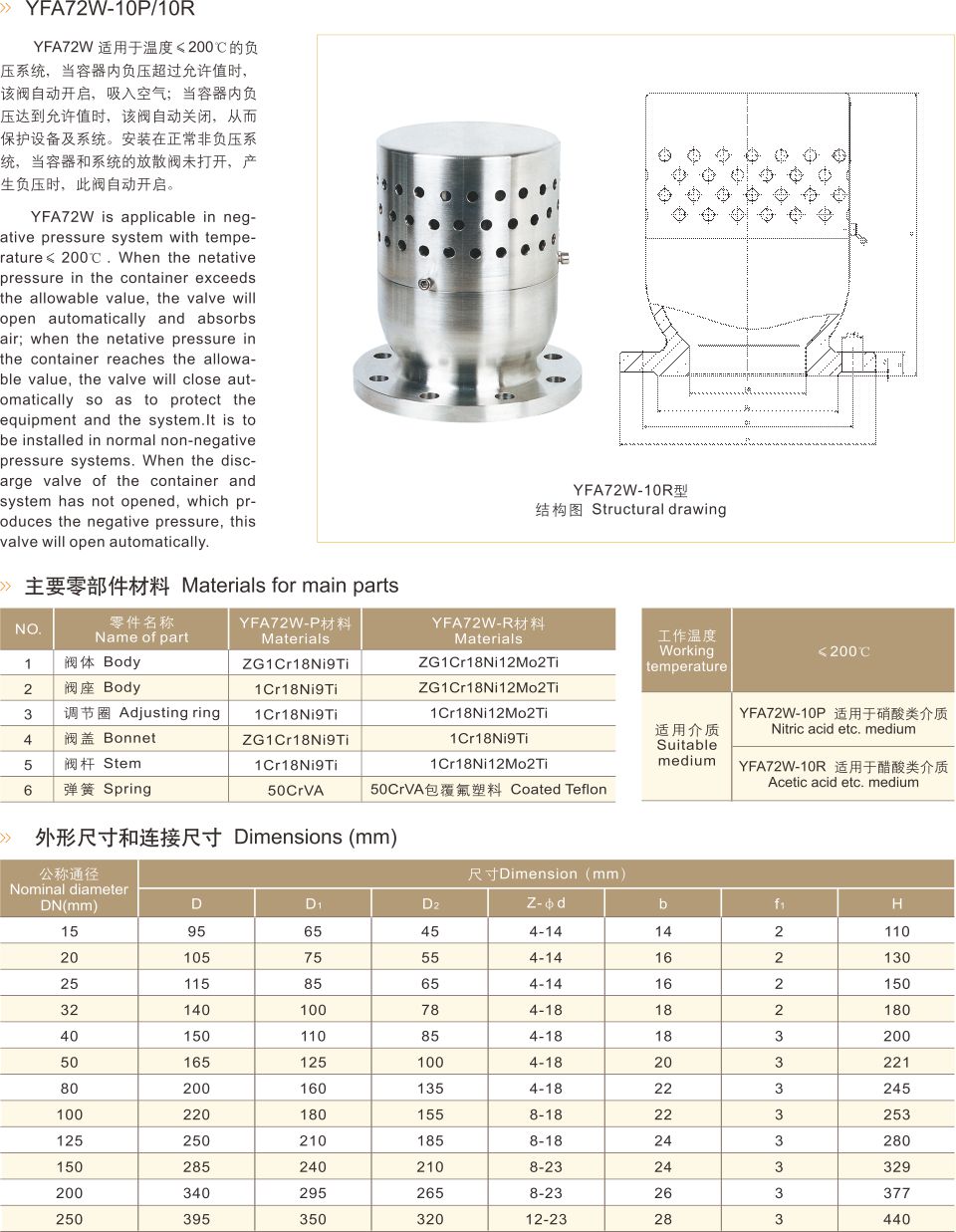 真空负压安全阀 YF72W适用于工作温度≤200℃的负压系统,当容器内负压超过允许值时,该阀自动开启,吸入空气;当容器内负压达到允许值时,该阀自动关闭,从而保护设备及系统。安装在正常非负压系统,当容器和系统的放散阀未打开,产生负压时,此阀自动开启。